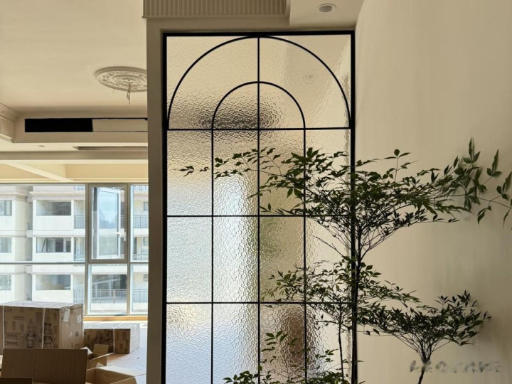 可是艺术玻璃隔断又换个方式又流行起来了。像现在的艺术玻璃隔断,图案更加抽象现代,再搭配极简金属框架,往往能够成为空间的艺术装饰。