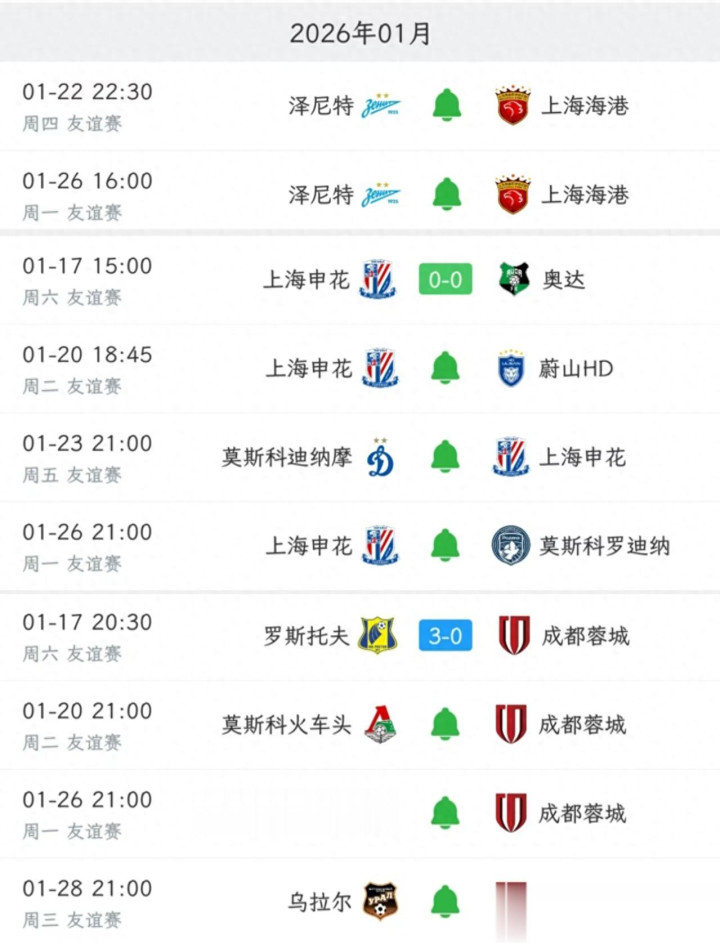 成都蓉城昨晚热身首秀0-3不敌俄超的罗斯托夫,接下来将在20号过招俄超的莫斯科火车头,26号迎战俄超的莫斯科迪纳摩,28号面对俄甲的乌拉尔。乌拉尔曾在去年热身赛上,点球不敌青岛西海岸。