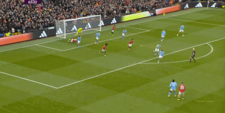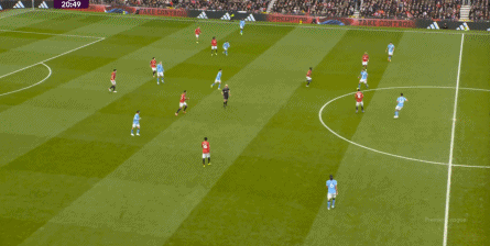 但是,曼城的后场拔升并不明显,所以在这次出球当中,姆贝乌莫的回撤接球依然轻松,阿克和罗德里都跟不上,这让曼联得以分到边路,完成了多尔古和阿玛德-迪亚洛的连线: